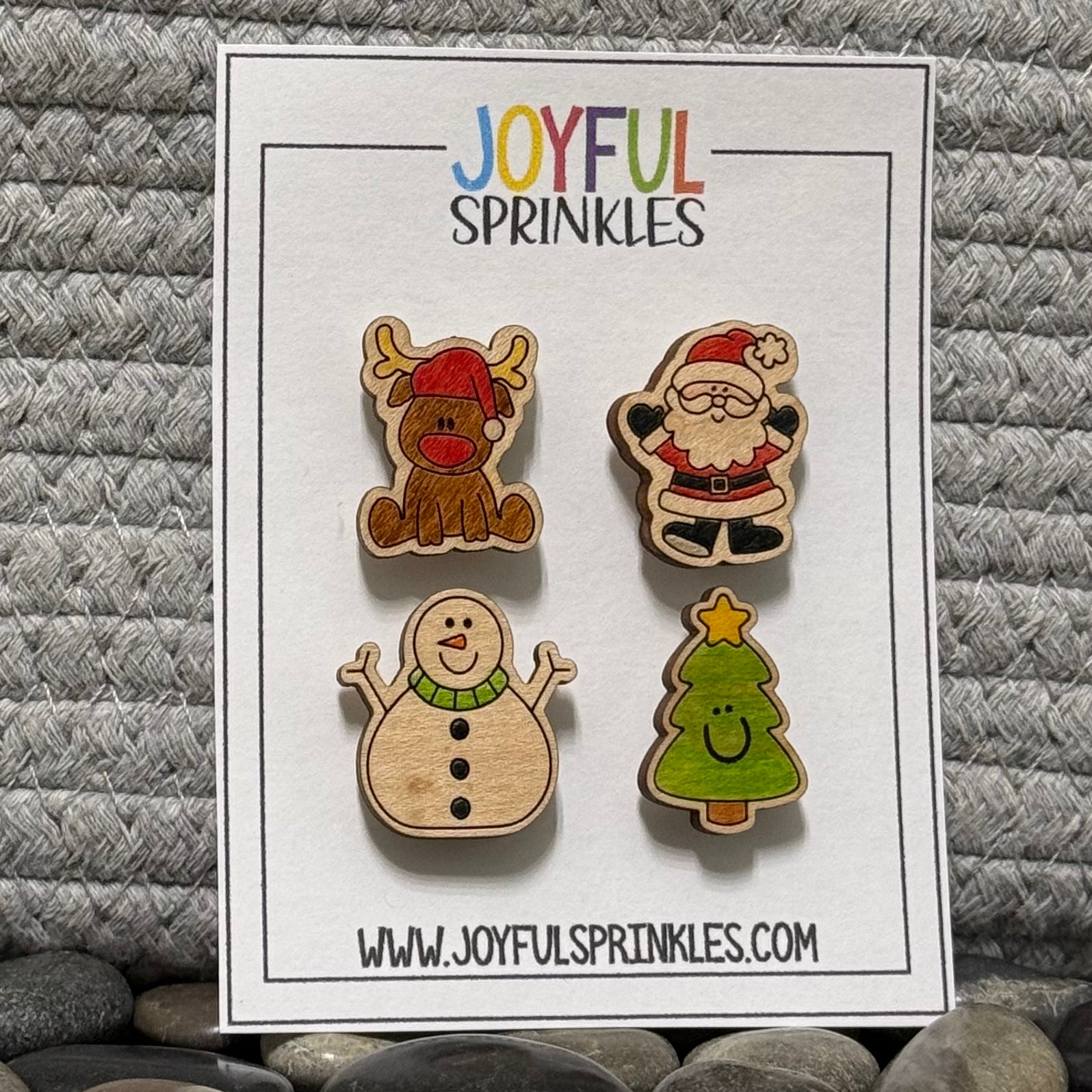 Bring instant holiday cheer to your home with this adorable Christmas magnet set from Joyful Sprinkles. Each set includes four festive characters: a sweet reindeer in a Santa hat, a classic Santa Claus, a happy snowman in a cozy green scarf, and a smiling Christmas tree topped with a star.