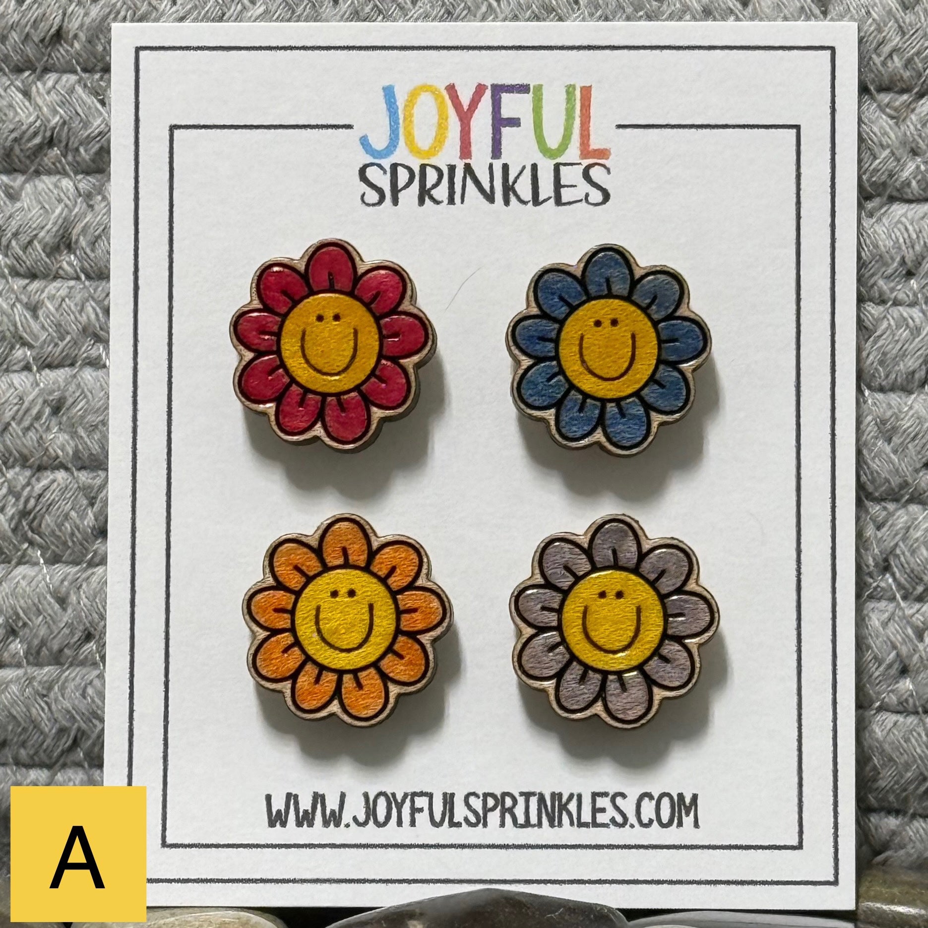 Brighten up your day (and your fridge!) with this set of happy flower wood mini magnets. Each mini magnet features a happy little flower face in a different color, printed on smooth wood and attached to a strong magnet – perfect for holding notes, photos, or kids’ artwork.
