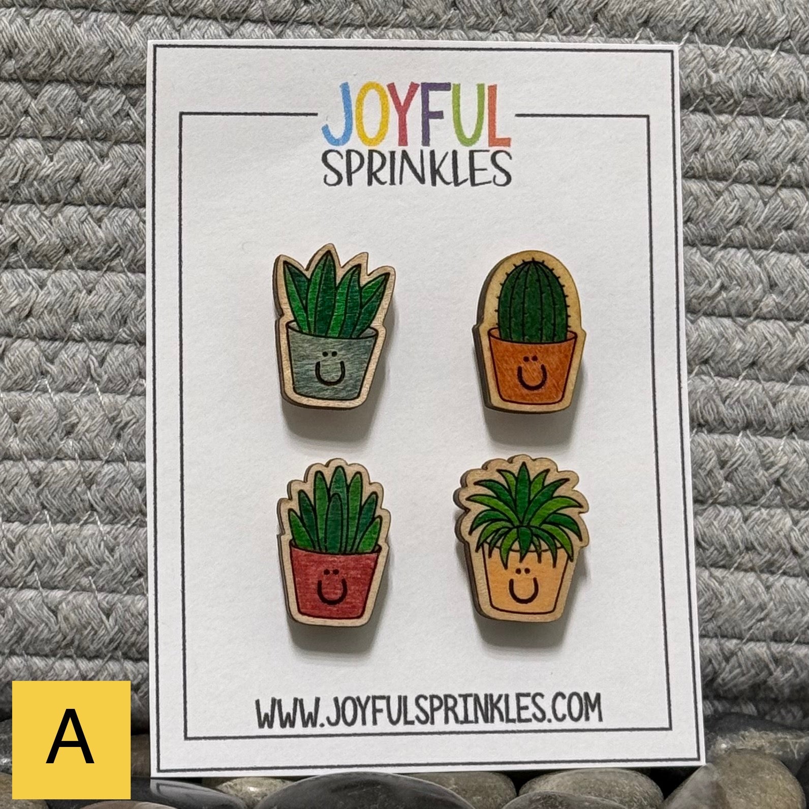 Bring a little happy greenery to your space! This charming wood plant magnet set features four happy potted plants, including succulents and a cactus, in warm, earthy tones. Perfect for plant lovers who want the look of plants—without the watering!